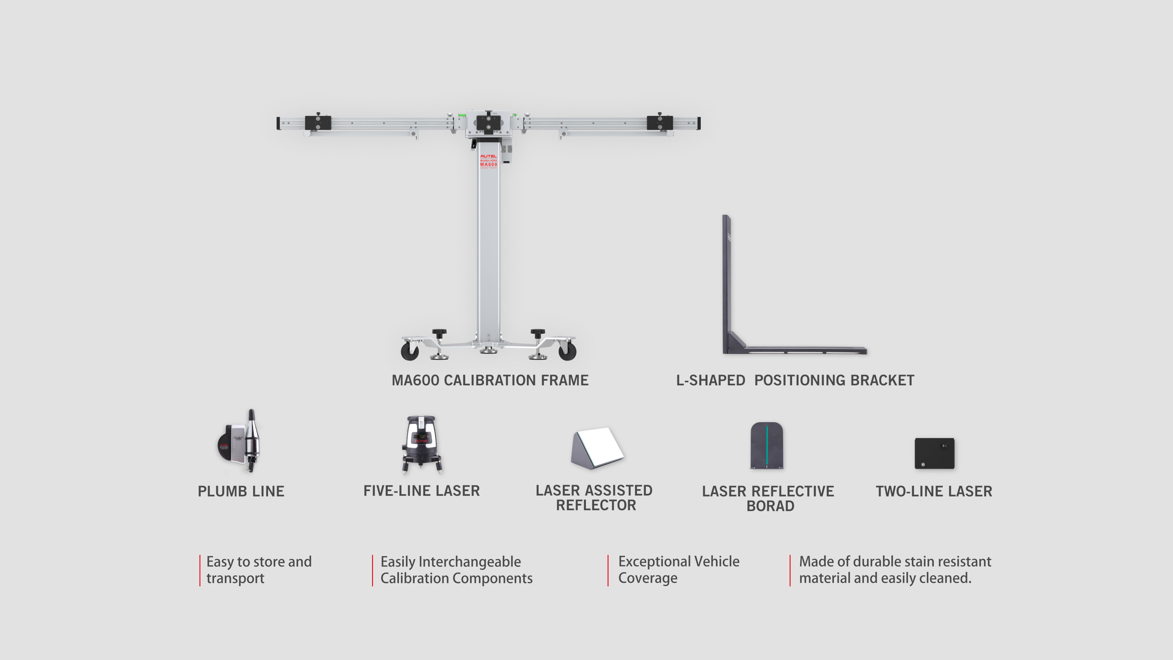 Autel’s MA600 Portable ADAS Calibration system includes a collapsible aluminum calibration frame, 2-line and 5-line centering and aligning lasers, laser-assisted reflectors and Lane Departure Warning (LDW) calibration target set for the calibration of vehicle camera systems. The MA600 is compatible with the MaxiSYS ADAS tablet, or the MaxiSYS MS906BT or higher tablet series when upgraded with ADAS software (purchased separately).