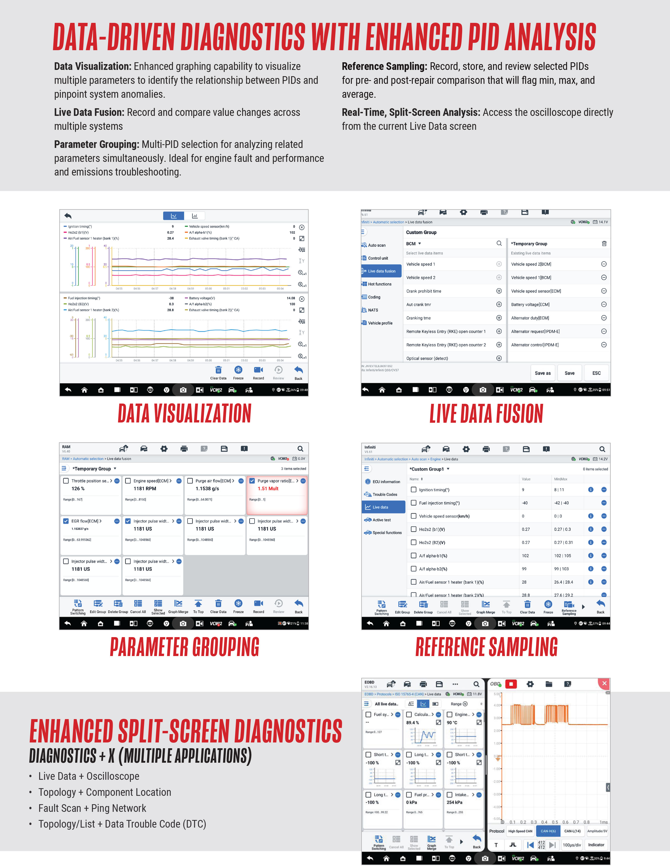 Multi-PID selection for analyzing related parameters simultaneously1. Ideal for engine fault and performance and emissions troubleshooting.