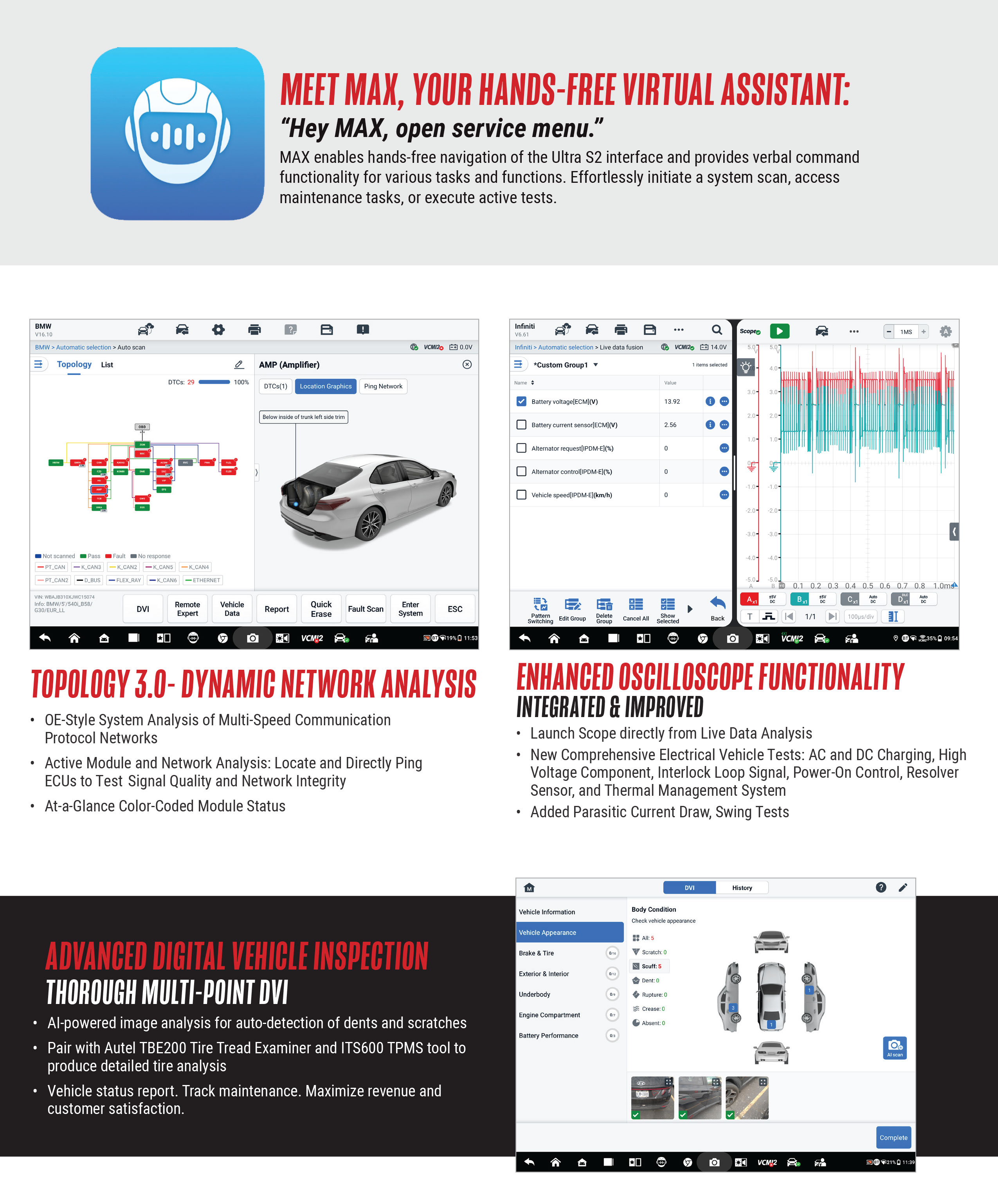 Hands-free virtual assistant MAX enables hands-free navigation of the Ultra S2 interface and provides verbal command functionality for various tasks and functions. Effortlessly initiate a system scan, access maintenance tasks, or execute active tests.