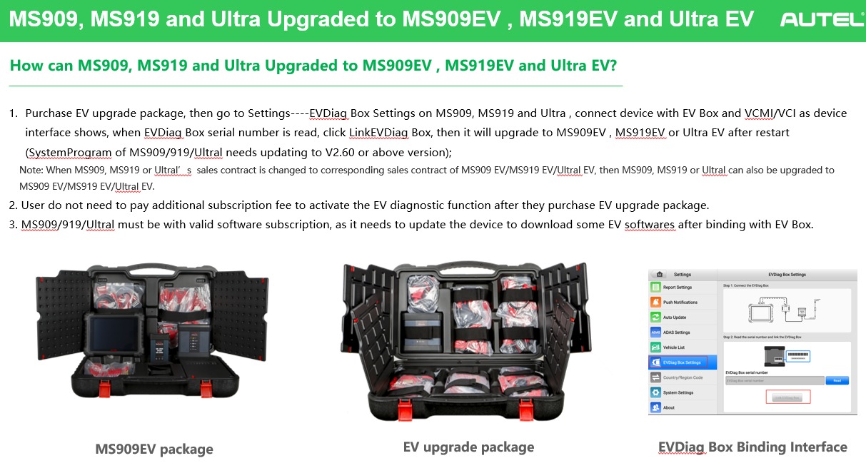 The EV Diagnostics Upgrade Kit includes EVDiag Box, testing software, and adapters for specific vehicles to enable testing of electric vehicle battery packs. The EVDiag Box is compatible with the MaxiSys Ultra, MaxiSys Ultra ADAS, MaxiSys MS919, and MaxiSys MS909.