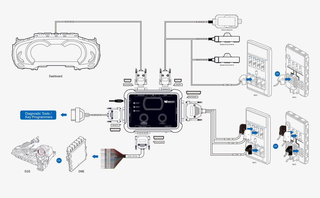 BMW G-series BDC2 & BDC3 test platform support connect BMW G-Series BDC2 or BDC3 immobilizer box, dashboard, antenna receiver, keyless entry antenna, and other ECUs too, for example EGS or DME, but without connector.