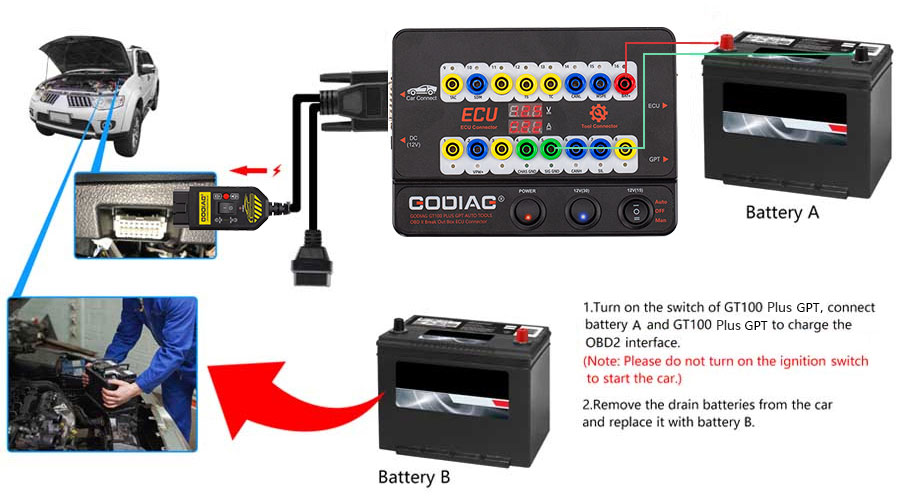 13.) Remplacement de l'alimentation auxiliaire de la batterie (mode de connexion de l'alimentation sans interruption). [En raison de la défaillance ou de l'absence de données de la télécommande antivol sur certains véhicules lors du démontage de la batterie, l'alimentation auxiliaire assure l'alimentation du véhicule via le GT100 PLUS GPT avant le remplacement de la batterie afin de maintenir l'alimentation du véhicule. Elle garantit ainsi la connexion de l'ECU du véhicule pendant le remplacement de la batterie.]