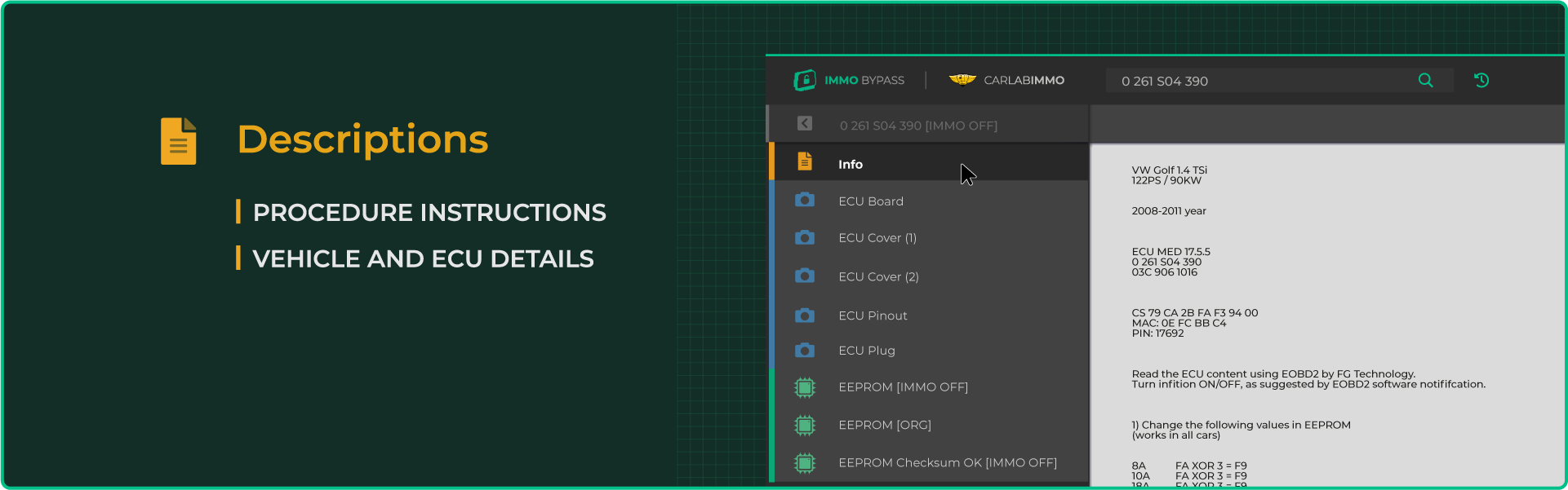 We provide text instructions that will guide you through theprocedures. You will also find car and ECU information included.