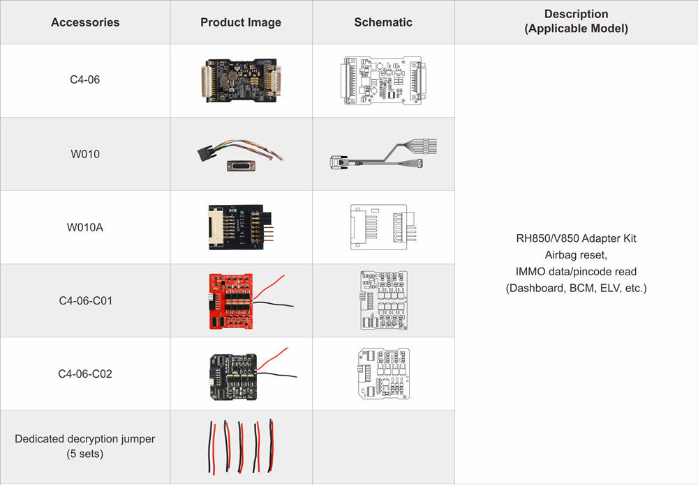 OBDSTAR RH850 / V850 Basic Adapter Kit is for airbag reset, immo data/pincode read (Dashboard, BCM, ELV, etc.). And all data read is unencrypted, can be used on third party devices!