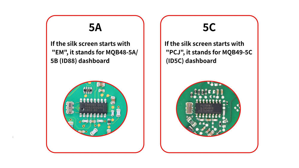 2) Disassemble the dashboard to confirm the dashboard type by the PCB silkscreen, such as the silkscreen start with“EM” , it stands for MQB48-5A/5B(ID88) dashboard, and “PCJ” stands for MQB48-5A/5B(ID88) dashboard.