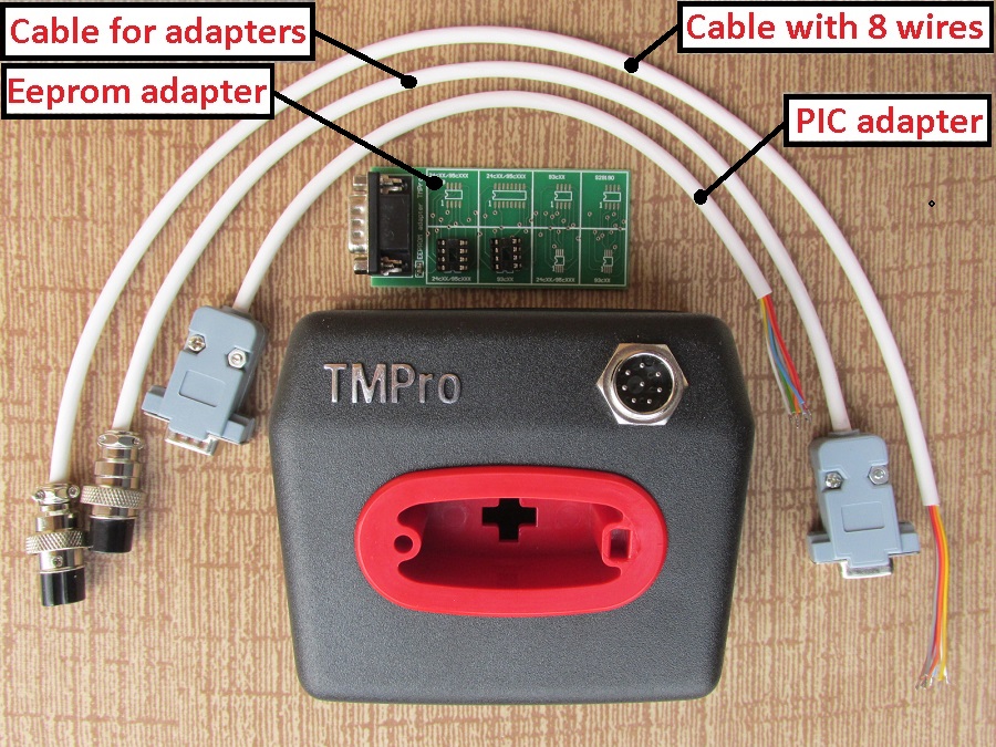 NOTE:Microchip PIC adapter, eeprom adapter, cable with 8 stripped wires and cable for adapters are included in basic set of TMPro2.