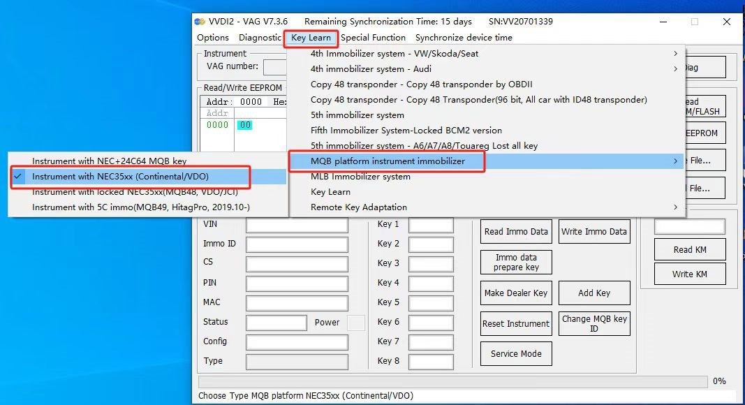 The MQB48 IMMO data will be generated. Load this data into the MQB35XX option to create and program keys.