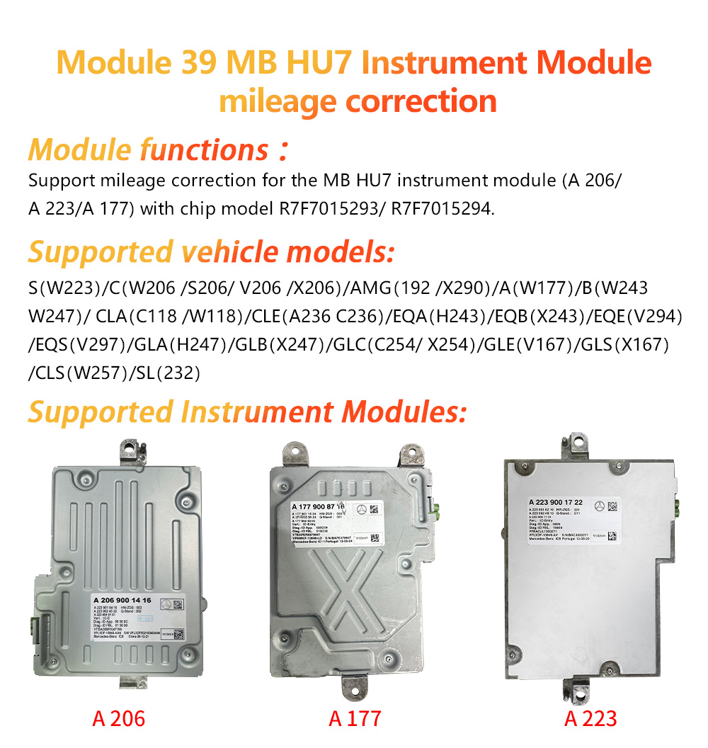 Support mileage correction for the MB HU7 instrument module (A 206/ A 223/A 177) with chip model R7F7015923/ R7F7015924.